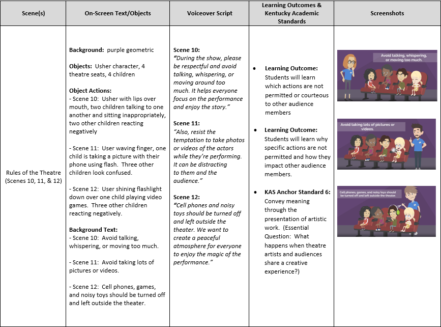 After proposing the idea of an animated instructional design video and receiving the historical and updated information as mentioned earlier, I translated this content into specific learning outcomes that would resonate with K-5 students. To ensure alignment with local educational standards, I anchored the project in the Kentucky Academic Standards for Theatre Appreciation. To seamlessly connect the RiverPark Center’s “Arts Teach Kids” educational objectives with the K-5 school environment, I adopted a backward design methodology. This approach involved crafting comprehensive visual descriptions and a voiceover script as foundational components that connected to the learning outcomes before diving into the visual design phase using Vyond Studio software.