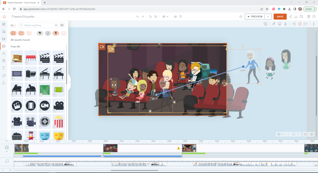 As previously mentioned, during the production of this animated video, I opted for Vyond video authoring software due to its authoring agility and array of animated assets. For the Theatre Etiquette video, I exclusively utilized the “Business Friendly” asset collection from Vyond due to its extensive library, featuring child characters that ensured consistency across every scene. When it came to characters, my intent was to present a diverse representation in each scene. Thus, as you engage with the project, you’ll encounter children and adults from various backgrounds, encompassing different abilities, religions, and ethnicities. This approach was a natural extension of my previous work with the RiverPark Center in the realm of diversity, equity, and inclusion. I aimed to ensure that the foundational principles we established in this area were seamlessly integrated into this “Arts Teach Kids” project.